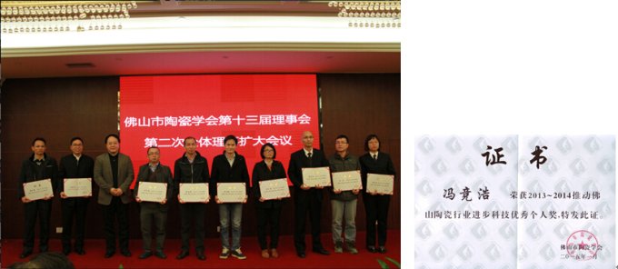 會上,學會討論審議了其過去一年的工作總結及本年度的工作計劃等內容,表彰了“2013-2014年推動佛山陶瓷行業進步科技優秀個人”,該獎項主要表彰在科技創新、節能減排、生產管理等方面做出貢獻的科技工作者,我司董事長馮競浩先生為獲獎者之一。最后,會議還以“陶瓷行業2014年技術創新及2015年發展趨勢”課題作了專題報告,給各企業帶來了寶貴的行業發展信息和戰略定位意見。(總經辦 張寶媚)